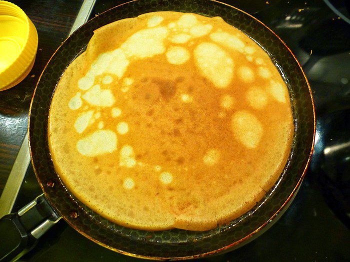 Выпекаем блинчики на сковороде. Для первого блина сковороду необходимо смазать маслом.