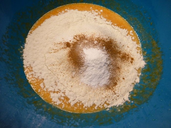 Добавляем корицу, разрыхлитель и просеянную муку. Размешиваем до однородности.