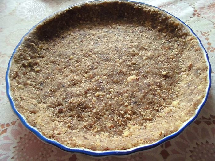 Изюм и грецкие орехи прокрутить через мясорубку. Взять форму (у меня керамическая, диаметром 21,5 см) и выложить туда основу, сделать бортики. Убрать в холодильник, пока буде готовиться начинка.