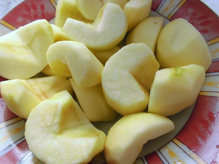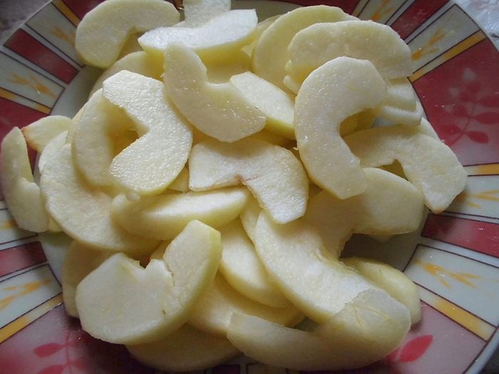 Оставшееся яблоко нарезать тонкими ломтиками и сбрызнуть его лимонным соком.