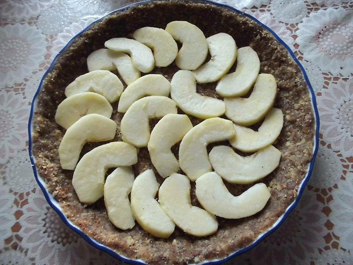 На основу выложить порезанное яблоко (у меня вместился только один слой), сверху распределить пюре. Убрать в холодильник минимум на час. В рецепте было написано, что будет лучше, если тарт настоится 12-15 часов. У меня он стоял почти сутки.