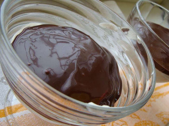 Черный шоколад растопить вместе с 33% сливками. Можно в микроволновке (30 сек) или на водяной бане. Главное не перегреть, иначе шоколад свернется. Вылить в креманки.