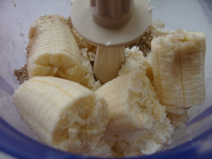 1 банановый слой. Желатин замочить 50 мл воды, оставить набухать (см инструкцию). Белый шоколад растопить в микроволновке (около 1 минуты). Банан и 100 г творога положить в блендер, взбить.