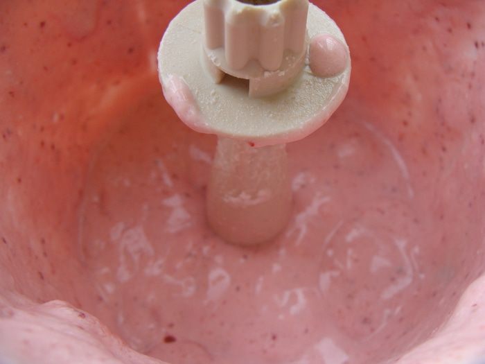 2 клубничный слой. 50 г творога и 60 г клубники (если без сахара, то добавить 1-2 ч. л. сахара), взбить. Добавить растопленный белый шоколад (15 г), желатин (25 мл), все еще раз перемешать.
