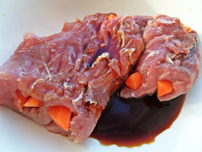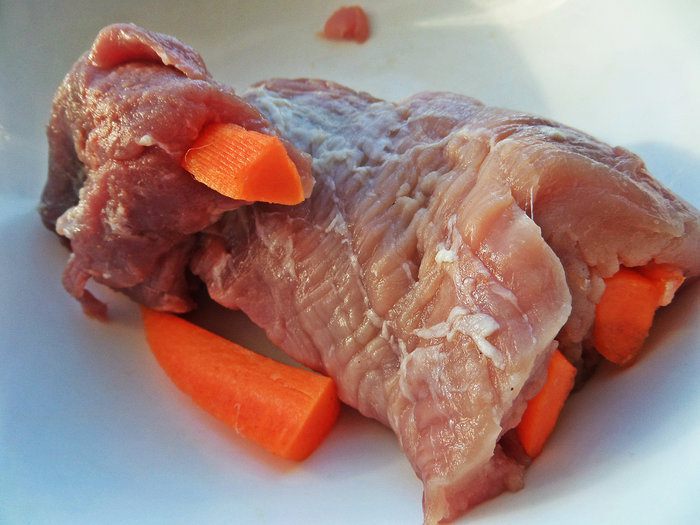 Мясо проколоть острым тонким ножом вдоль волокон и прокрутить ножом отверстие-окно, чтобы вставить морковные шпажки. Это сделать легко, мясо мягкое, податливое.
