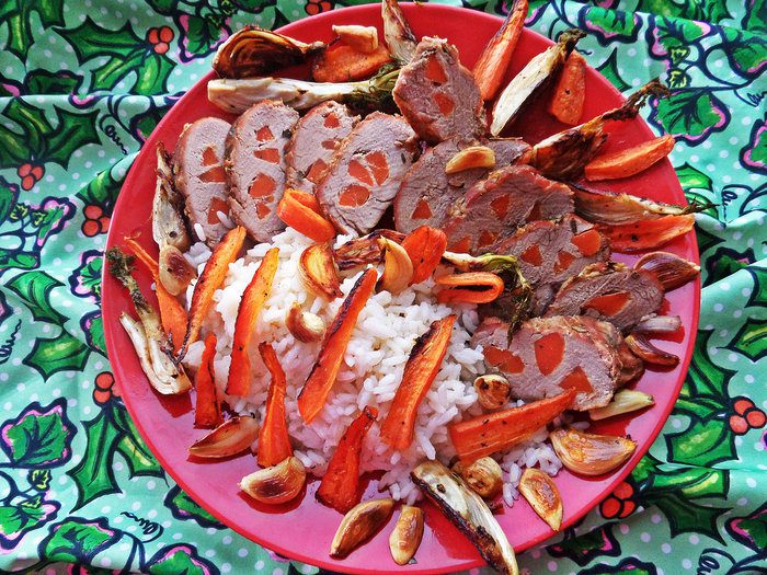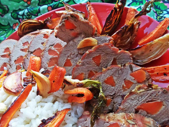 Решила запечь свинину с овощами, но чтобы был интересней разрез, нашпиговала мясо морковкой!