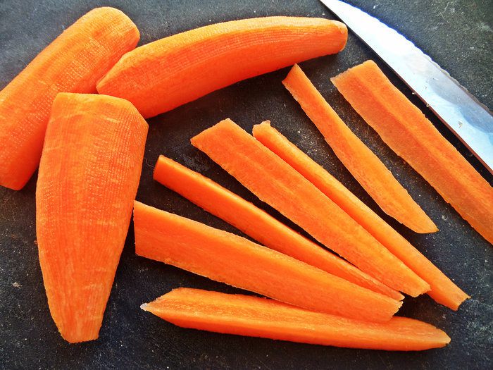 Морковь очистить и нарезать шпажками (чем тоньше, тем лучше).