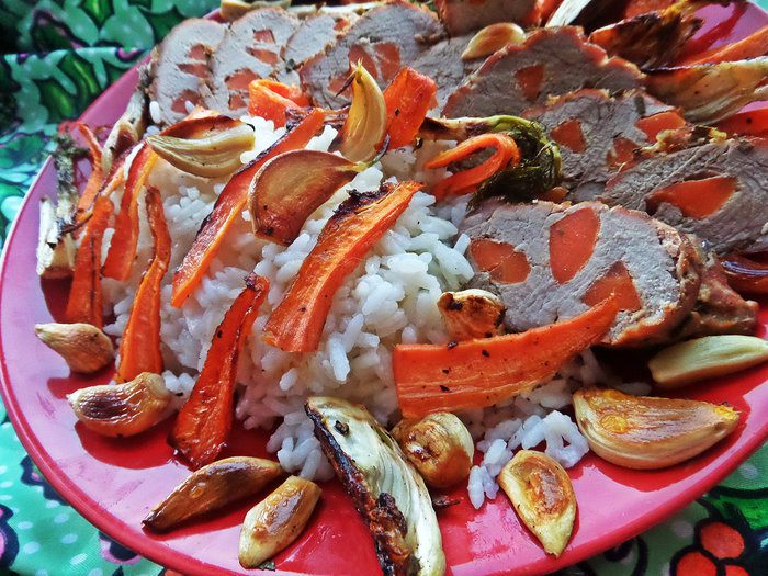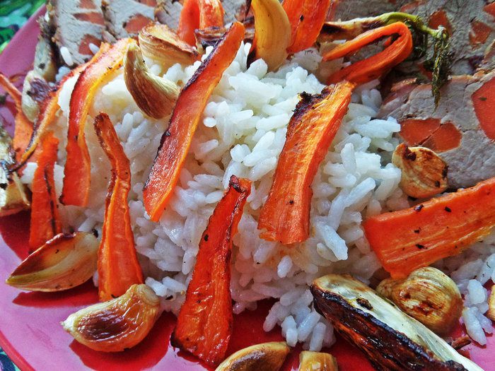 Подаём разрезанное мясо с рисом и остальными овощами вместе на одном большом блюде! Приятного аппетита, друзья!