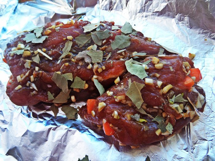 Перенести на фольгу и раскрошить на мясо несколько лавровых листиков.