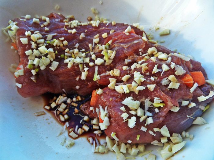 Нашпигованный кусок обманкуть (даже можно оставить на несколько минут) в соевый соус (вместо маринада и соли).