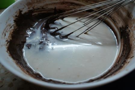 Всыпать муку и какао-порошок. Перемешать лопаточкой.