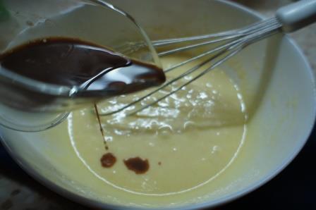 В отдельной миске растереть желтки и сахарную пудру пока они не посветлеют. Сюда же влить растопленное сливочное масло, кофе и ванильный экстракт. Перемешать.