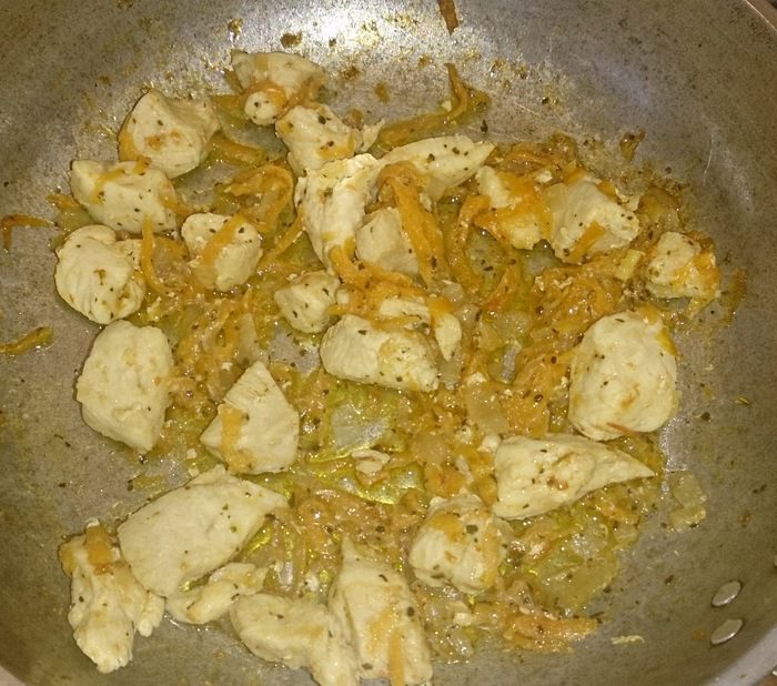 Макароны "перья" ставим варить. Тем временем очищенный лук шинкуем и морковь трем через крупную терку. Все это обжариваем на сковороде в подсолнечном масле. Куриное филе нарезаем кусочками и добавляем к луку и морковки.