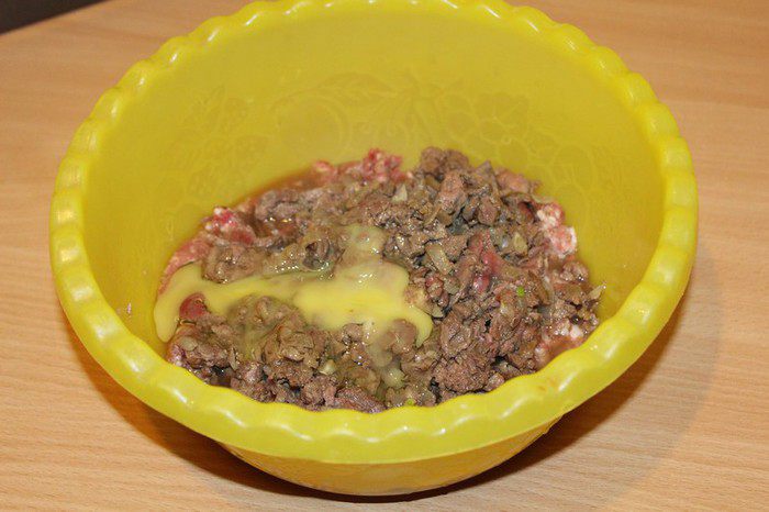 Добавить фарш, яйцо, коньяк, посолить, поперчить. Хорошо перемешать.