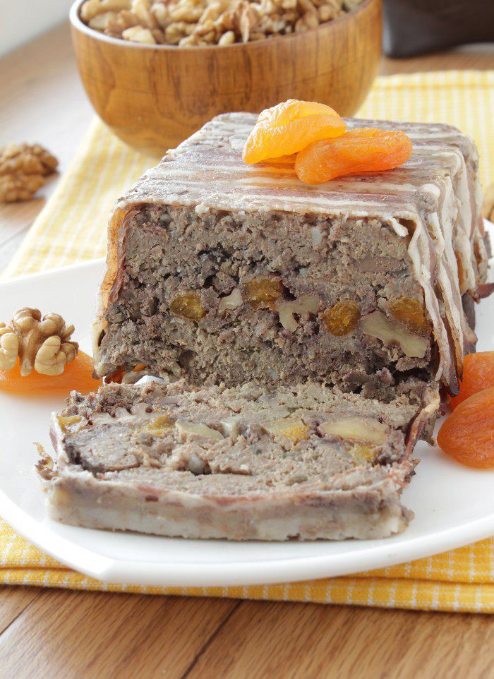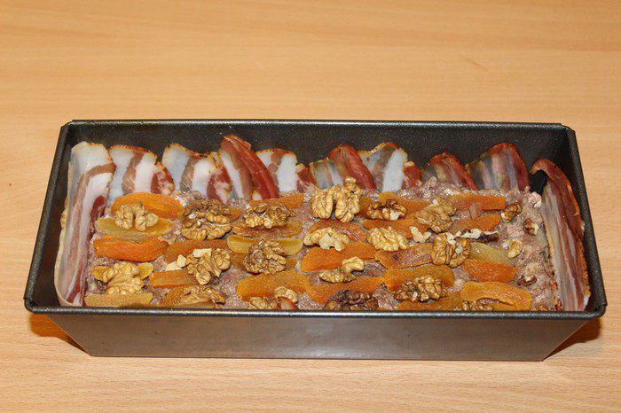 Ничего сложного в этом террине нет, весь смак заключается в контрасте сладковатой кураги, хрустящих орехов и мяса. В итоге вкус получается весьма сбалансированным и немного пикантным.
