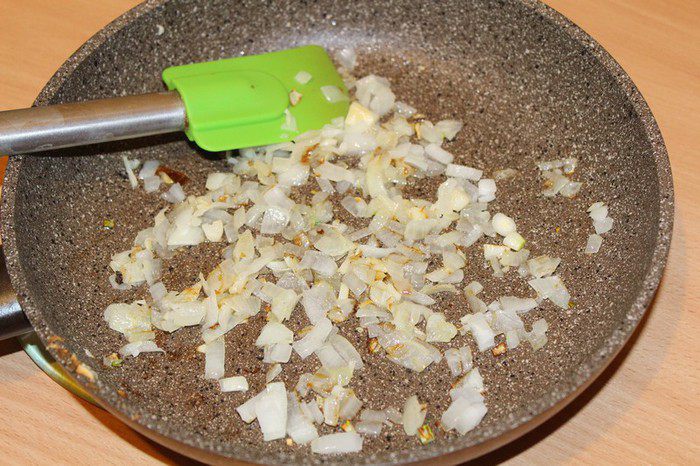 Мелко порезать лук и чеснок. Обжарить в разогретом растительном масле, помешивая, около 2-3 минут.