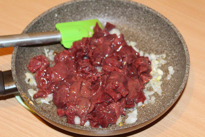 Добавить мелко порезанную печень, жарить, помешивая, еще около 3 минут.