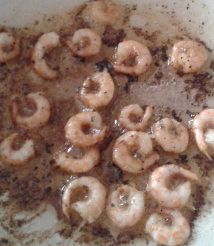 Креветки обжарить на растительном или оливковом масле. Когда креветки хорошо подогреются, возьмите ложку коньяка, вылейте в сковородку и подожгите. Когда пламя погаснет, креветки готовы (можно обойтись без этой экстремальной процедуры). Также слегка посолите и поперчите.