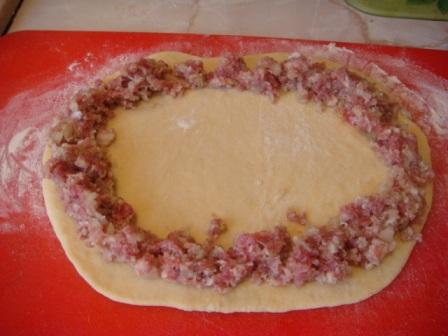 Начинка: 2 кусочка белого батона (мякоть раскрошить и замочить в воде), лук мелко порезать, фарш, соль, перец. Все перемешать.