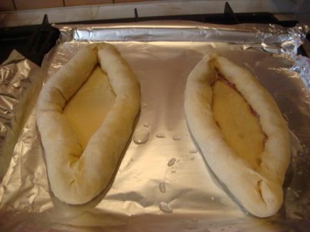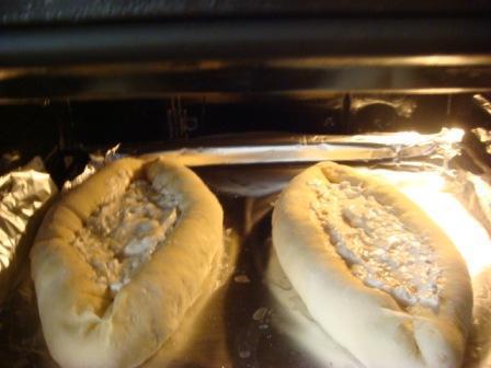 Замесить тесто: муку указала примерное кол-во, тесто не должно липнуть к рукам (опарным способом) и поставить в тепло на 3 часа. Через 1 час чашу встряхнуть, тесто должно подняться 2 раза. Тесто разделить на 3 равные части.