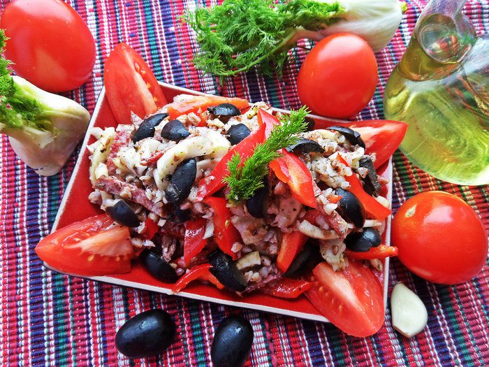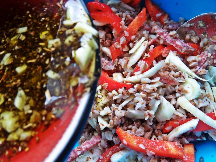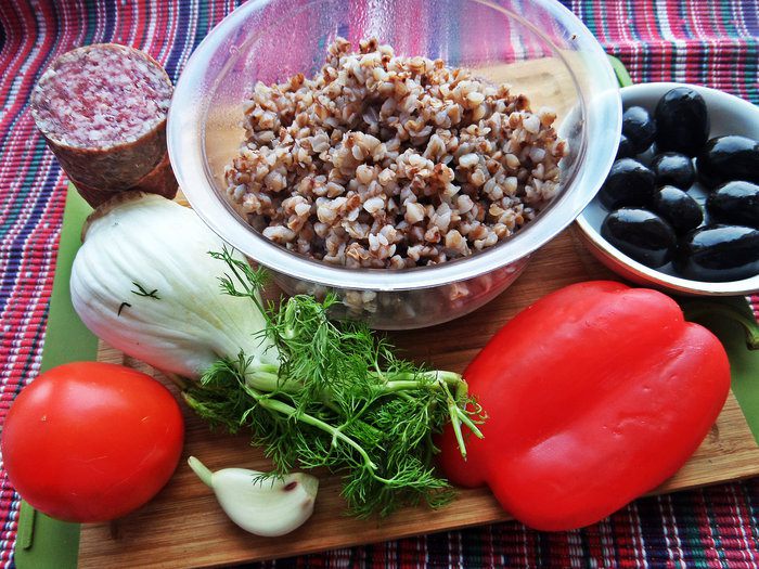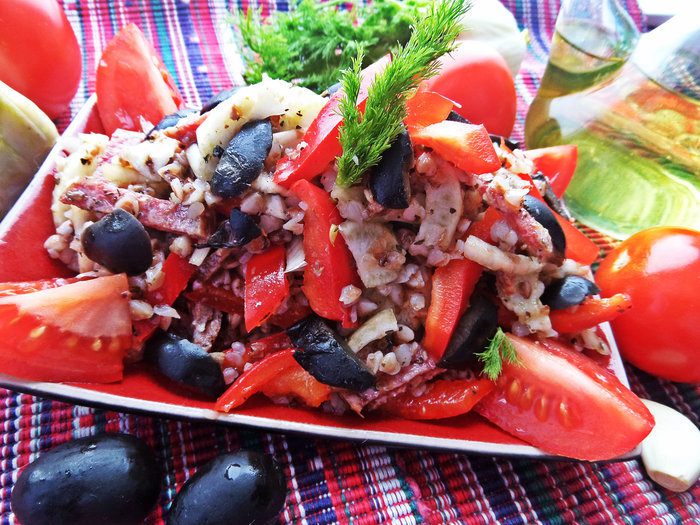 Мы привыкли кушать гречку в горячем виде на гарнир, но вот в салате с таким дополнением она тоже вполне вкусна!