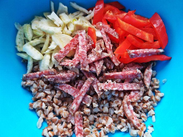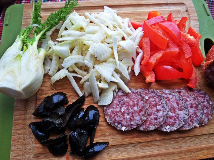 Салями тонко нарезать пока кружочками, потом соломкой, перец-соломкой, оливки крупные очистить от косточек, если есть. Фенхель нарезать примерно как перец. Последнее время полюбила фенхель за его ореховый привкус и сочность.