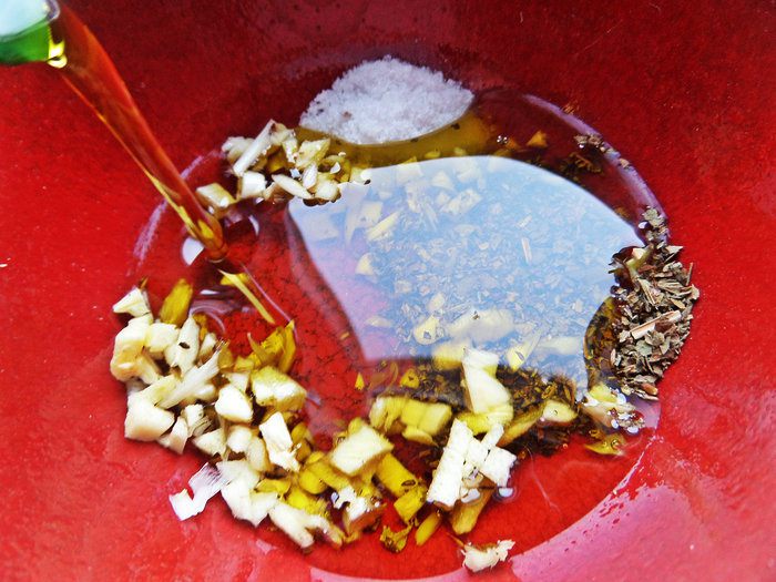 Для заправки измельчить чеснок, всыпать базилик и соль.
