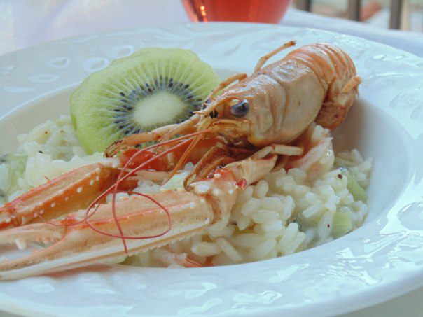 Удивительное и изысканное сочетание риса с лангустинами, креветками, киви и игристым вином Просекко. Необычное, нежное и кремовое ризотто порадует Вас весенним настроением!