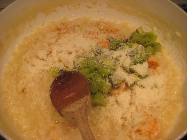 Готовое ризотто снять с огня, добавить киви, креветки, оставшееся сливочное масло и тертый пармезан. Попробовать на соль. Перемешать. Дать подружиться ароматам в течении 5 минут.