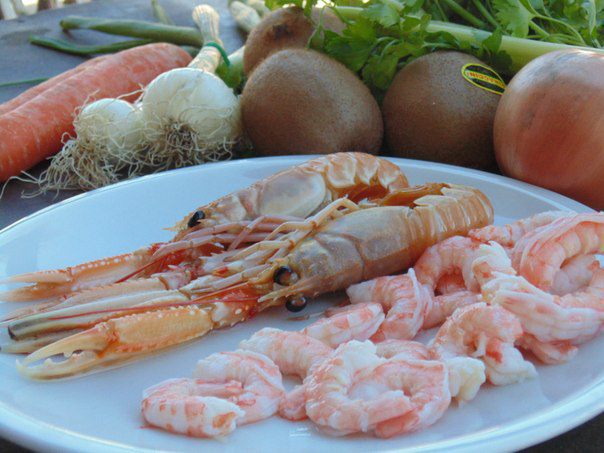 Подавать горячим, украсив кружочками киви и лангустинами.