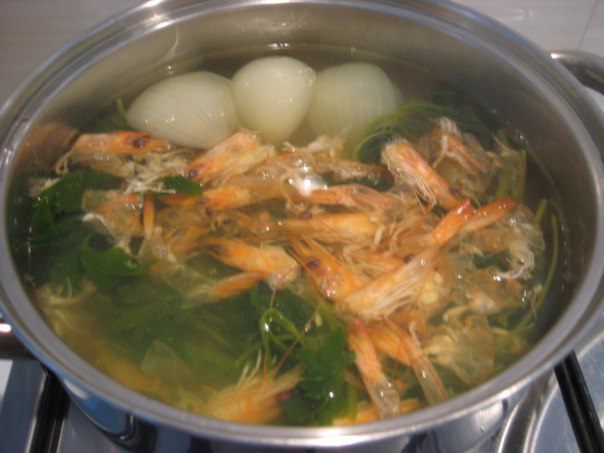 Добавить в бульон головы и панцири креветок, лавровый лист и варить еще 10 минут. Готовый бульон процедить, держать горячим на слабом огне.