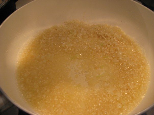 Лук-шалот мелко порезать. В глубокой сковороде разогреть 20 грамм сливочного масла, на слабом огне обжарить лук, должен стать мягким и прозрачным. Добавить рис и, помешивая, обжарить в течении 2 минут.
