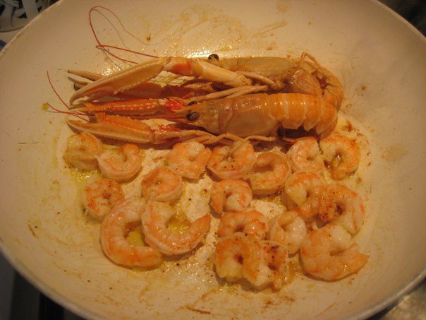 В отдельной сковороде на сильном огне обжарить на оливковом масле с зубчиком чеснока креветки и лангустины. Посолить, поперчить красным острым перцем.