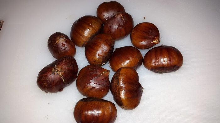 Каштаны моем, делаем крестообразные надрезы и варим в кипящей воде 10 минут, чтобы их легко было очистить.