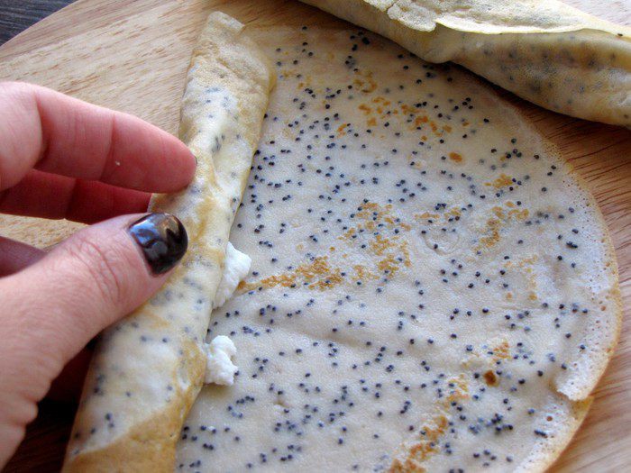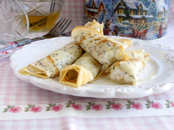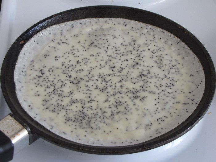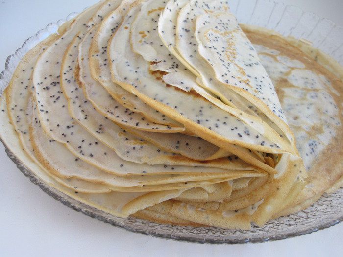 Испечь тонкие блинчики по вашему любимому рецепту, добавив в тесто 2 ст. л. мака.