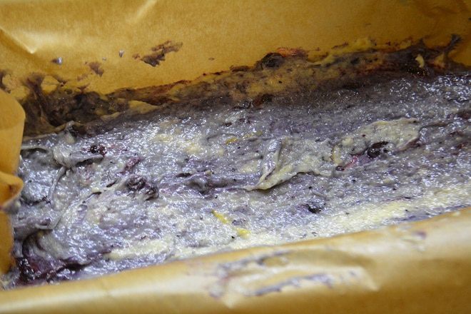 Форму смазать подсолнечным маслом и выстелить пекарской бумагой. Выложить тесто и разровнять.