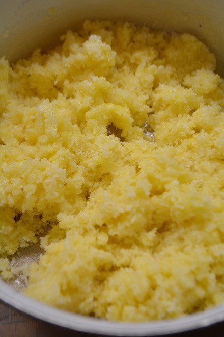Из оставшегося масла, сахара, кокосовой стружки и яйца замесить крошкообразное тесто.
