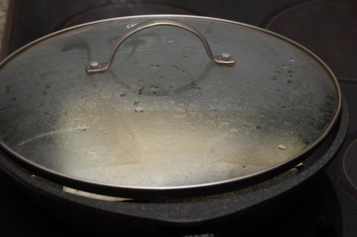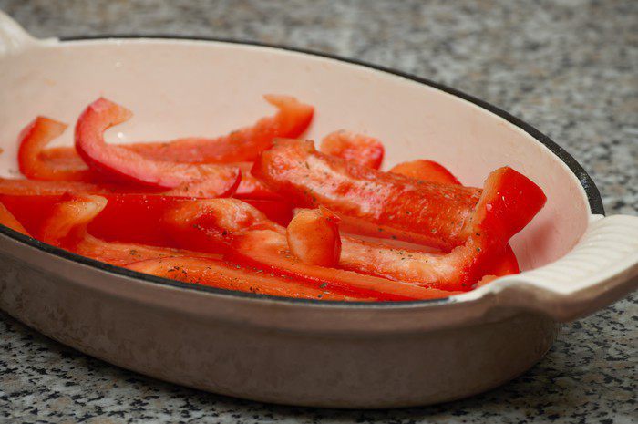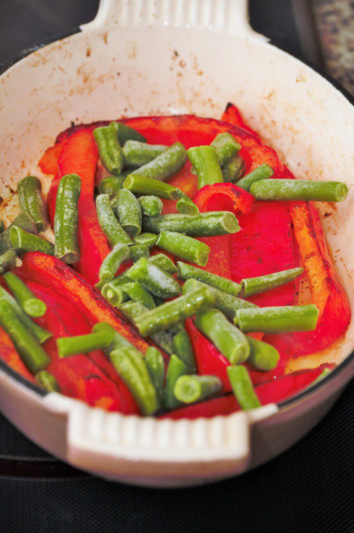 Не забываем о перце! Как только на нем появятся первые подпалины - добавить к нему замороженную фасоль. Убираем в духовку еще на 2 минуты. Но вы ориентируйтесь на свой гриль! Возможно, вам понадобится больше или меньше времени.