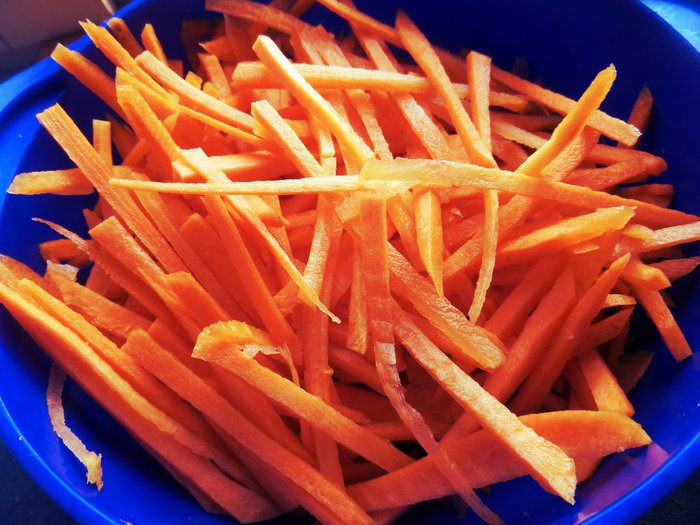 Нарезаем тонкой соломкой с помощью тёрки или ножом.