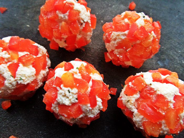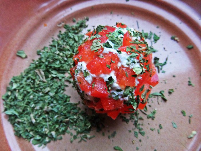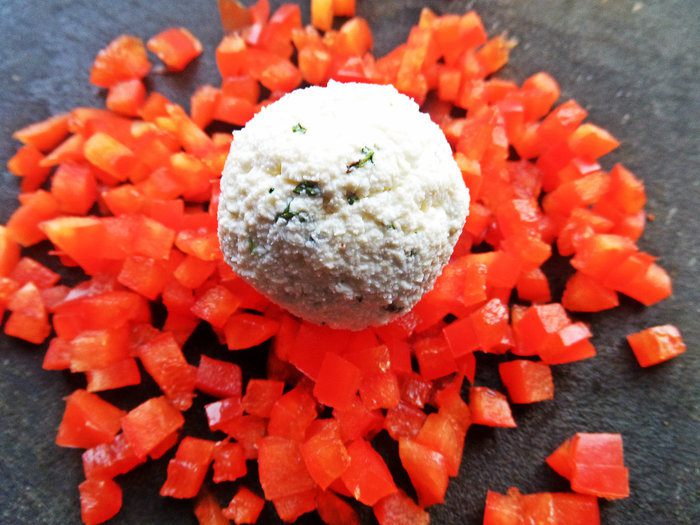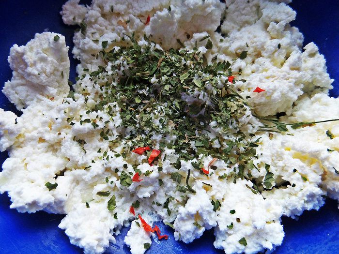 В это время делаем шарики из брынзы или, как я, из творога. Поперчим, посолим, добавим петрушки. Брынзу солить не надо.