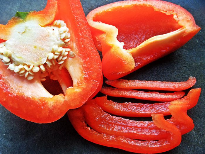 Красный перец разрежем на полосочки, а потом изрубим в крошку.