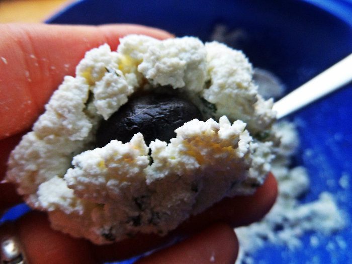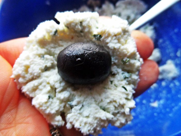 Берём ложку массы, расплющиваем и в центр кладём маслинку.