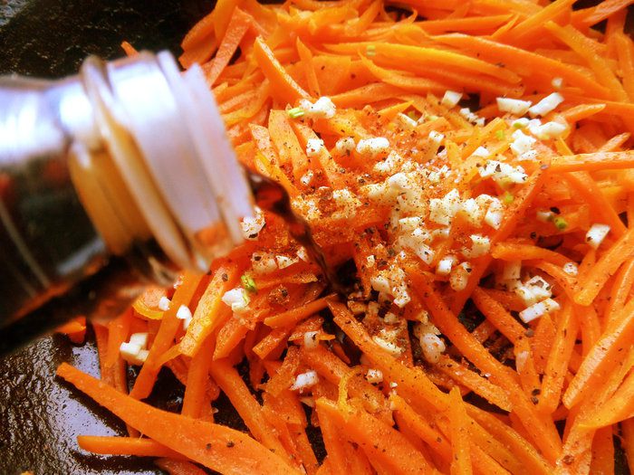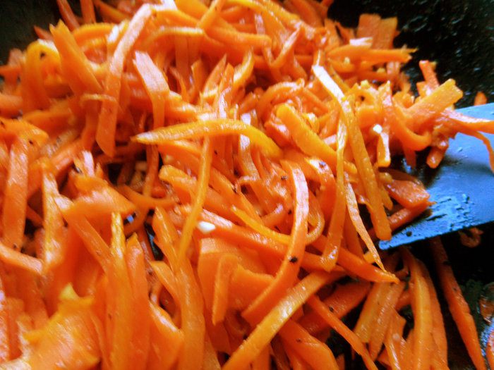 Когда морковка станет мягче, добавим соевый соус вместо соли. Перемешиваем, снимаем с огня.