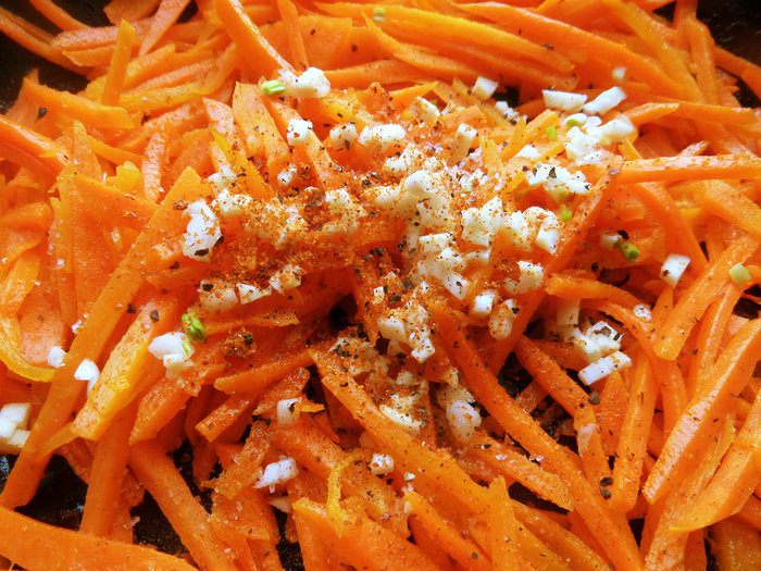 Отправляем на горячую сковороду с маслом, посыпаем рубленным чесноком, приправами с восточными ароматами.