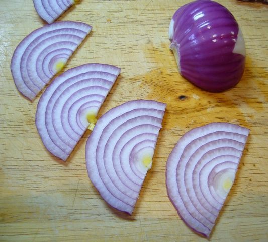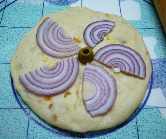 В серединку вдавить оливку, украсить полукольцами красного лука.