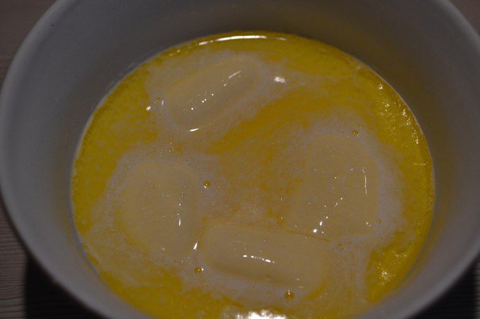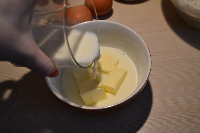 Перед тем, как добавить маслянисто-молочную смесь в тесто, нам нужно сделать следующее: возьмем небольшое количество этого же теста и добавим в мисочку с маслом и молоком, хорошенько перемешаем. Теперь это можно вводить в тесто.