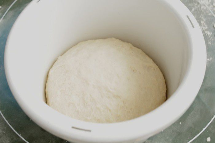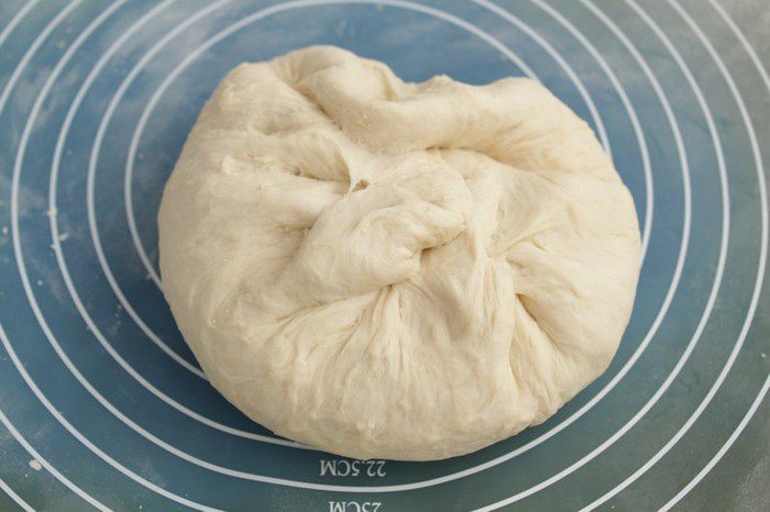 Далее снова вымесить тесто до шелкового состояния около 5 минут. Свернуть тесто в тугой шар и уложить в смазанную маслом посуду. Дать тесту 40 мин для брожения пока не удвоится в объеме.