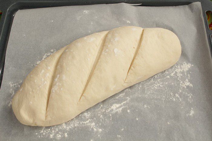 Перед выпечкой выложить аккуратно батон на бумагу для выпечки, сделать по 3 косых надреза.