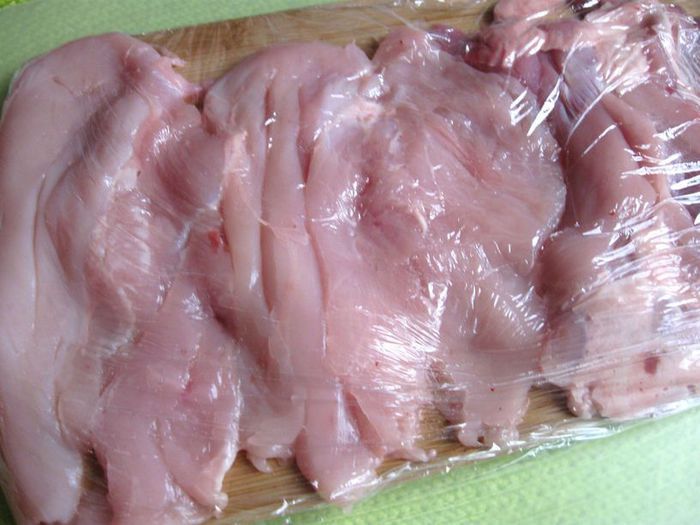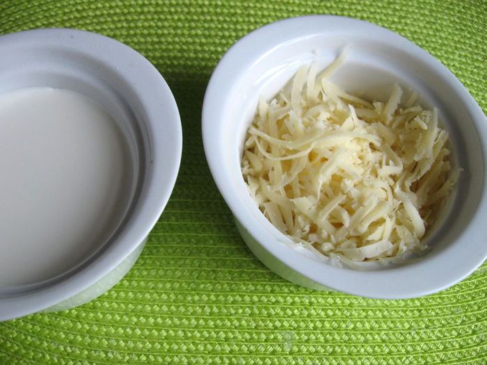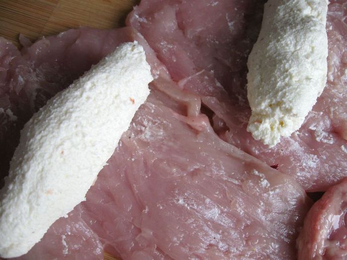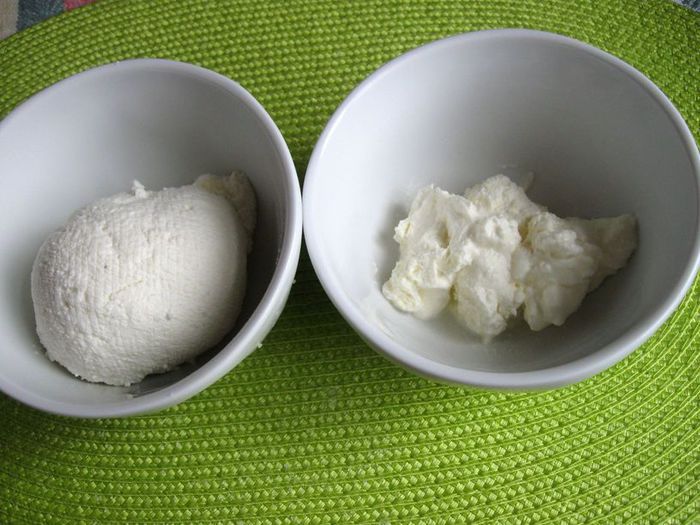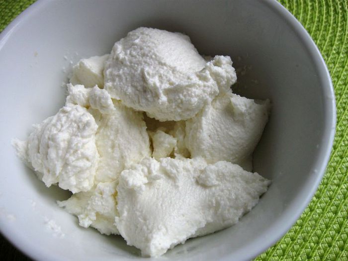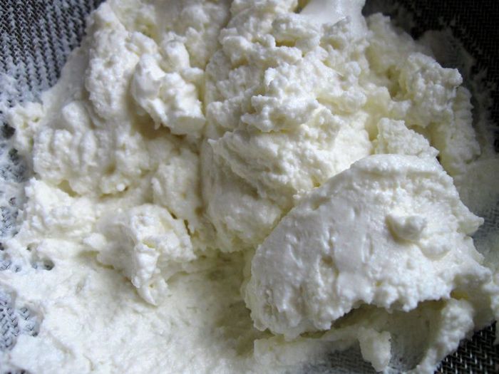 Приготовить творог. Молоко с солью (0.5 ч. л.) поставить на средний огонь, помешивать. Довести до температуры 82-86С, не кипятить. Если нет термометра, то до появления первых пузырьков. Снять с огня. Влить лимонный сок, перемешать. Сразу начнут образовываться хлопья, дать постоять 5 минут, больше не мешать, откинуть на дуршлаг и застеленный 2 слоями марли. Дать сыворотке отделиться 10-15 минут, отжать. Снять марлю. У меня получилось 140г творога.