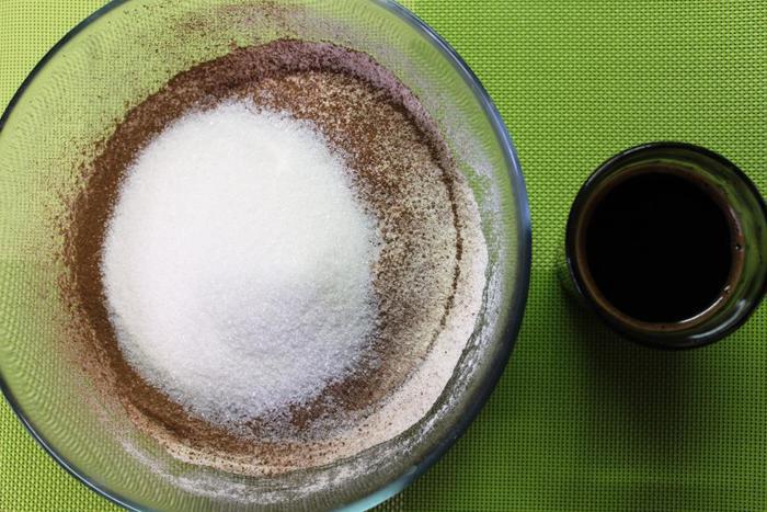 Пока кофе немного остывает, просеять в миску муку, 3 ст. л. с горкой порошка какао, соду, рызрыхлитель и ванилин. Добавить сахар и перемешать.